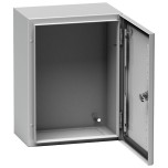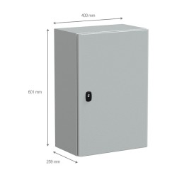 Coffret mural en acier PanelSeT S3D avec porte pleine. Corps monobloc, sans plaque de montage. Construction robuste basée sur un nouveau design. Système de fermeture à 3 points avec poignée et insert de verrouillage à double barre de 3 mm. Fabriqué en acier, finition poudre époxy-polyester. Rail avant en forme de gouttière à double épaisseur. Degrès de protection IP 66, IK10, gris clair RAL 7035. 1 plaque passe-câbles incluse, standard. Vaste gamme d'accessoires. L'emballage est réutilisable après assemblage.