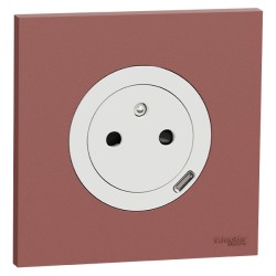 Ensemble complet : Prise 2P+T affleurante + chargeur USB-C blanc craie, livrée avec sa plaque de finition couleur rose grenat.