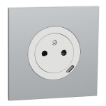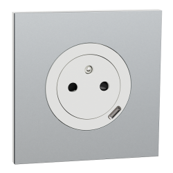 Ensemble complet : Prise 2P+T affleurante + chargeur USB-C blanc craie, livrée avec sa plaque de finition métal effet aluminium.