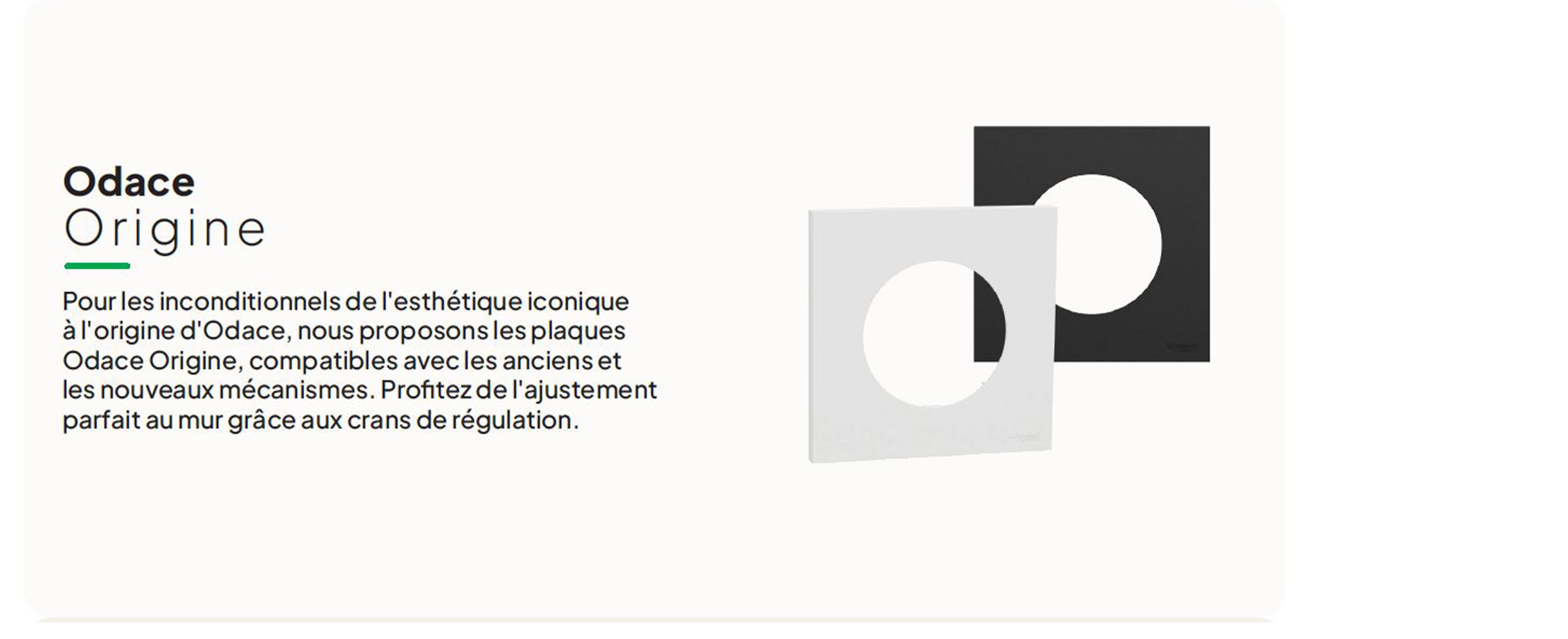 Pour les inconditionnels de l’esthétique iconique à l’origine d’Odace, nous proposons les plaques Odace Origine, compatibles avec les anciens et les nouveaux mécanismes.