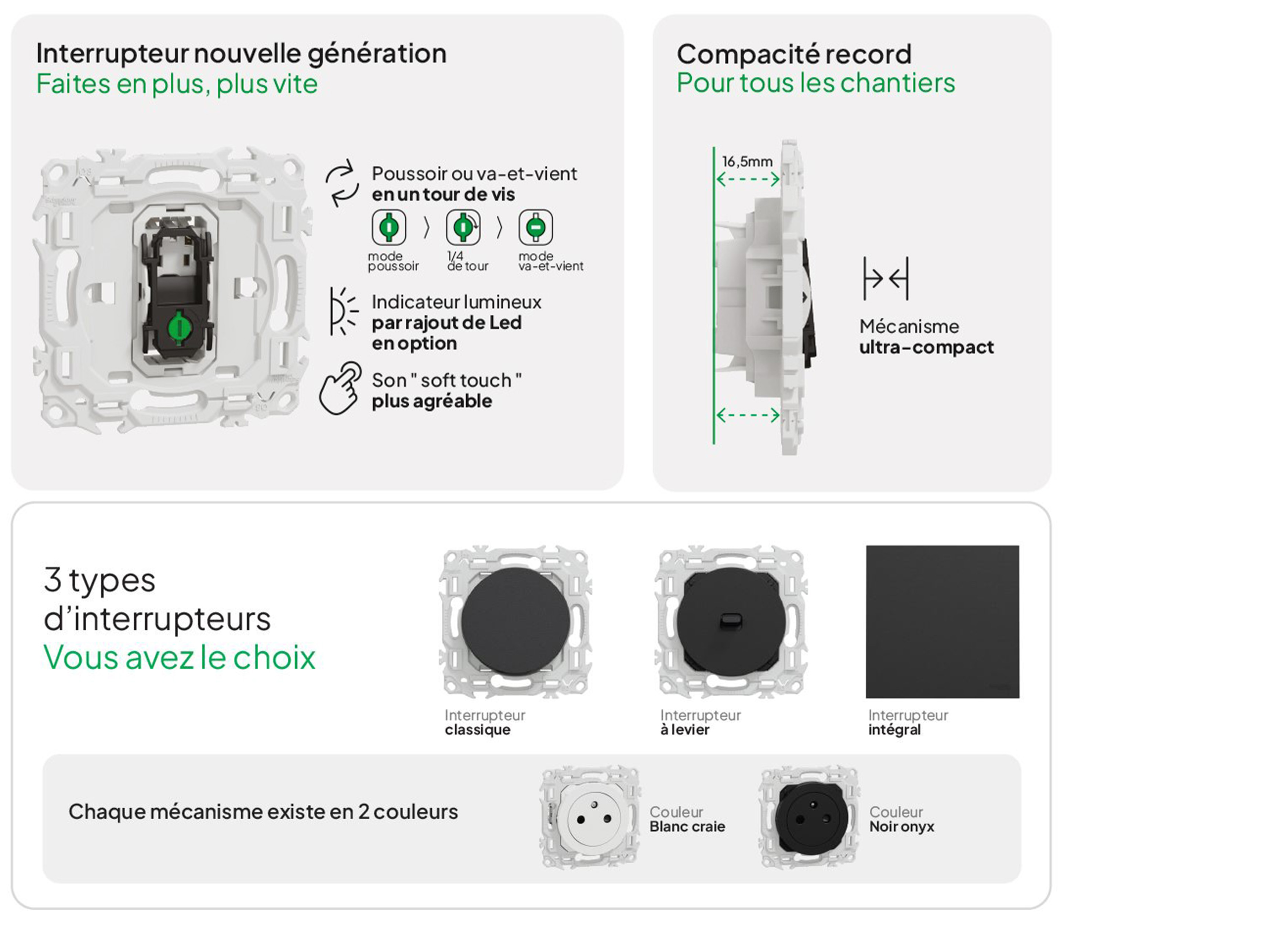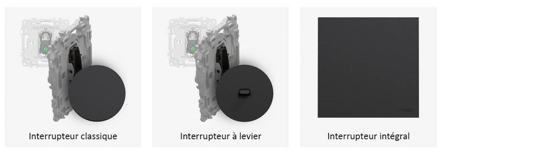 Grande innovation de cette gamme : un seul mécanisme permet de créer 3 types d’interrupteurs en changeant l'enjoliveur (classique, à levier ou intégral).