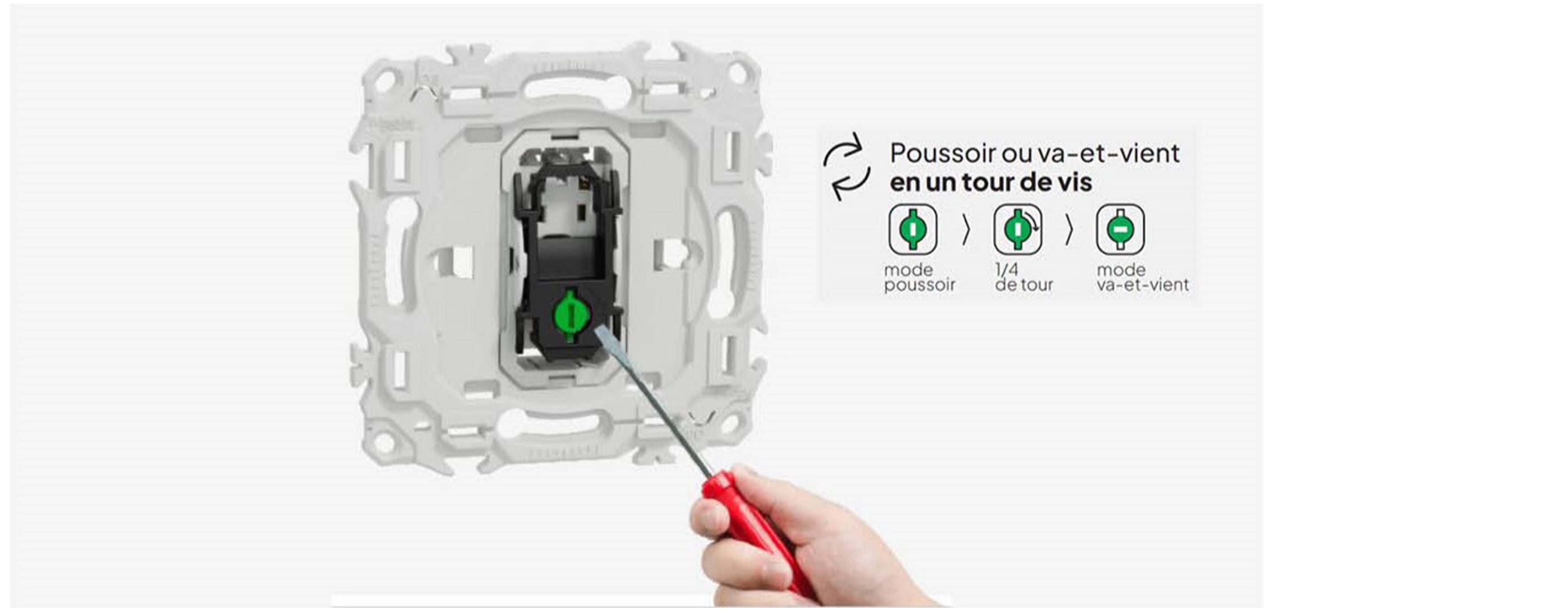 En un simple quart de tour, il est possible de transformer un va-et-vient en poussoir, offrant une flexibilité unique pour l’installateur comme pour le client final.