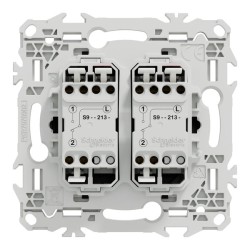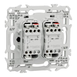 Grâce à son support rigide, le mécanisme se fixe facilement dans toute boîte d’encastrement, avec vis ou griffes clipsables en option, parfaitement adaptées à la rénovation. Les 2x3 bornes automatiques acceptent jusqu’à 2 câbles de 1,5 mm² rigides, souples ou multibrins par pôle, garantissant un raccordement simple, rapide et sécurisé, tout en réduisant les risques d’erreur lors du montage.