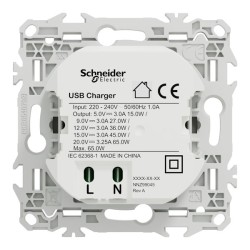 Le chargeur est livré avec son support de fixation intégré et un cache peinture. Il doit être associé à une plaque de finition Odace, Odace Métal, Odace Architecte ou Odace Origine.