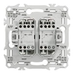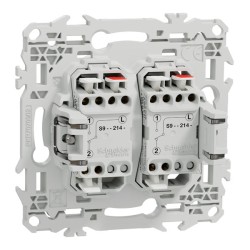 La fixation du mécanisme est facile et robuste grâce à son support rigide et ses griffes pré-montées, idéales pour la rénovation. Le produit dispose de 2 x 3 bornes automatiques permettant le raccordement jusqu’à 2 câbles de 1,5 mm² rigides, souples ou multibrins pour chaque pôle. Cette conception réduit le temps de montage et limite les risques d’erreur.