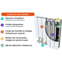 L’esthétique d’un radiateur de chauffage central. Un système de mise en chauffe fluide caloporteur, efficace et durable grâce à son huile minérale parfaitement inaltérable. La réactivité du corps de chauffe alumium. La solidité et la durabilité d’un appareil intégralement métallique : un corp de chauffe 100% alumium recyclé et un habillage latéral en acier. Les fonctions intégrées d’économie d’énergie L’écran de commande LCD rétro éclairé avec 3 programmes libres et 3 programmes préenregistrés.